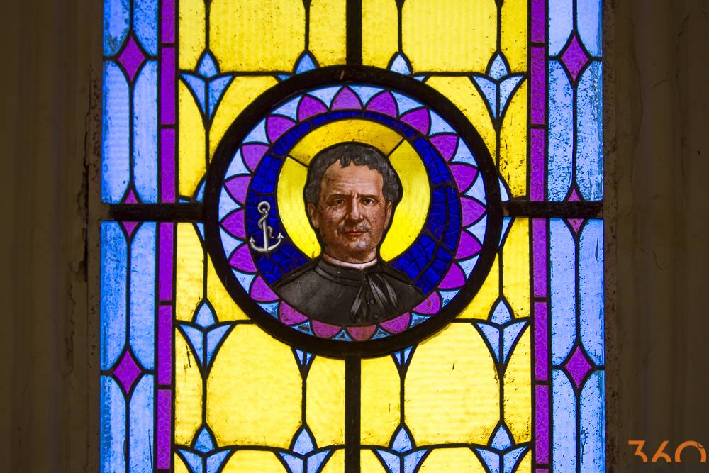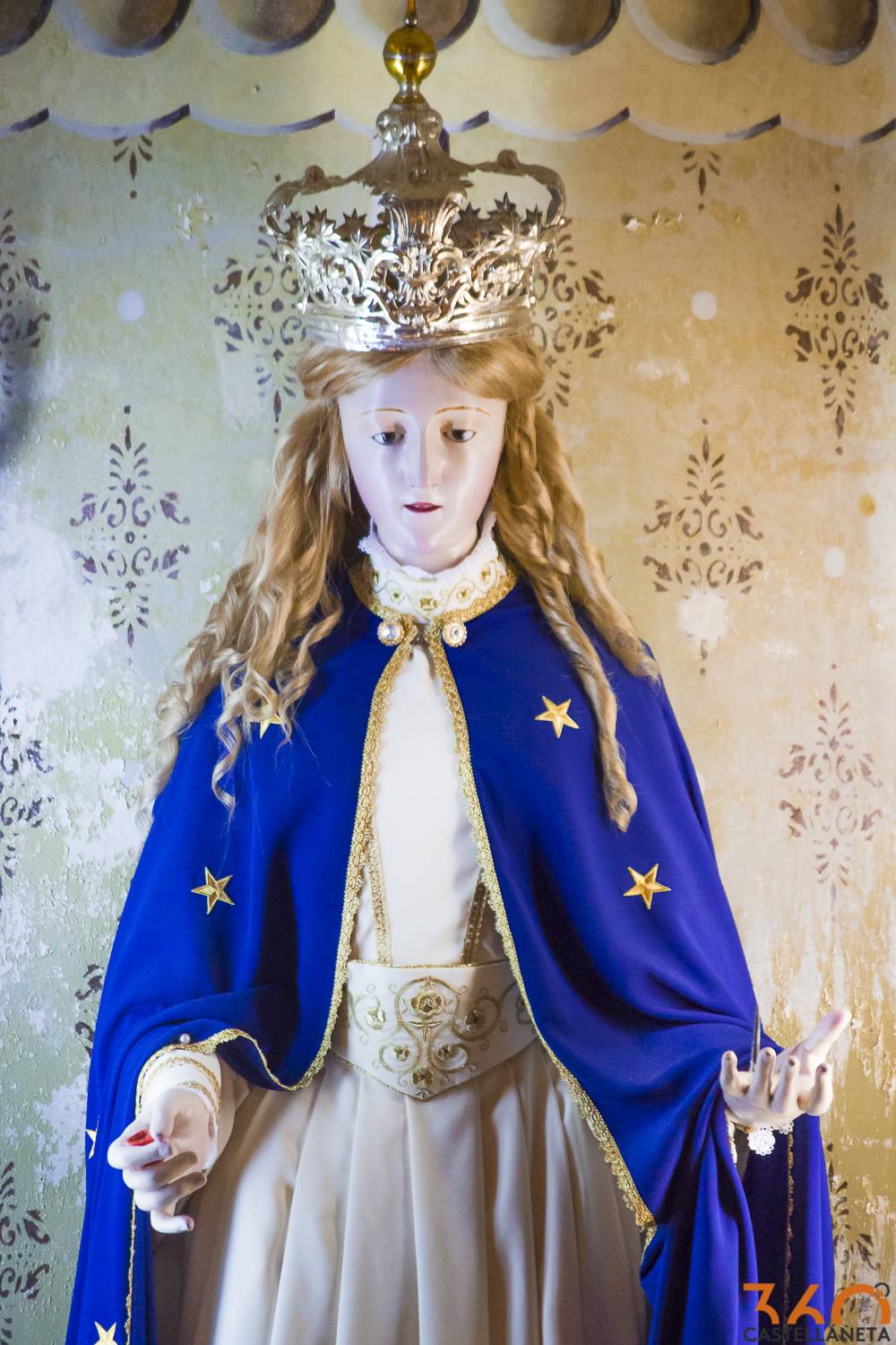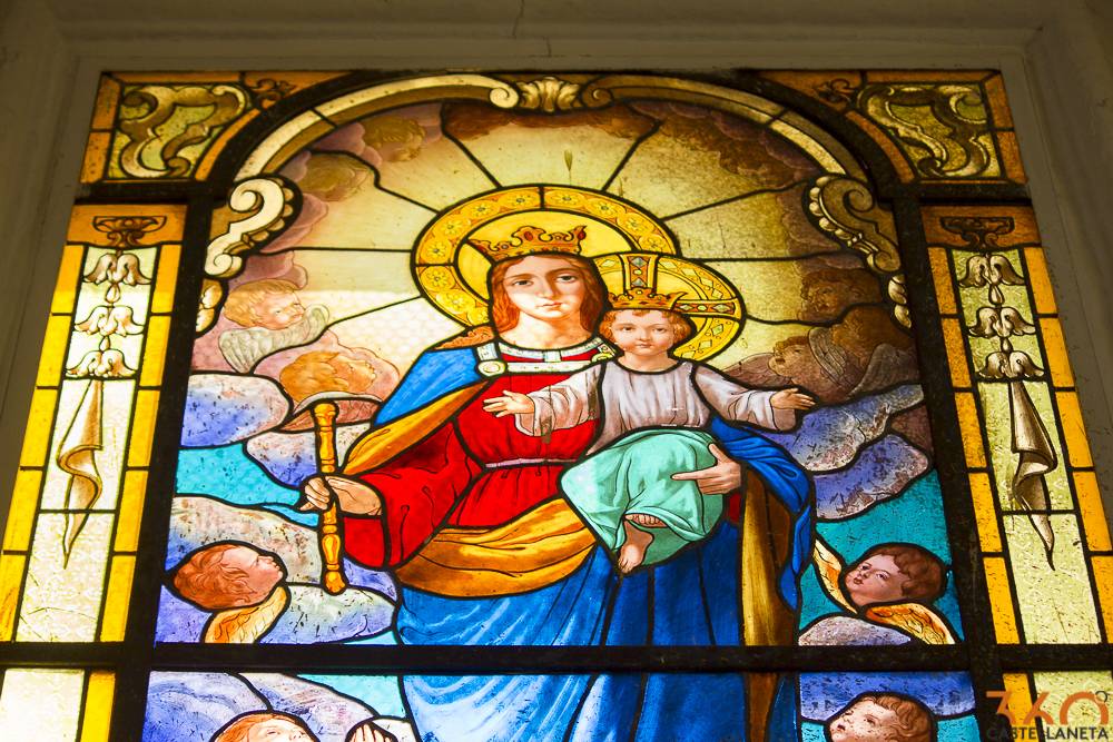 In the upper part of the altar, two Corinthian columns of green marbled stucco with a broken tympanum and a finial with the image of the Eternal Father frame the niche with the statue of Our Lady of Aid, made in 1938 by a craftsman from Ortisei (in Trentino-Alto Adige) to replace the original from the 18th century.