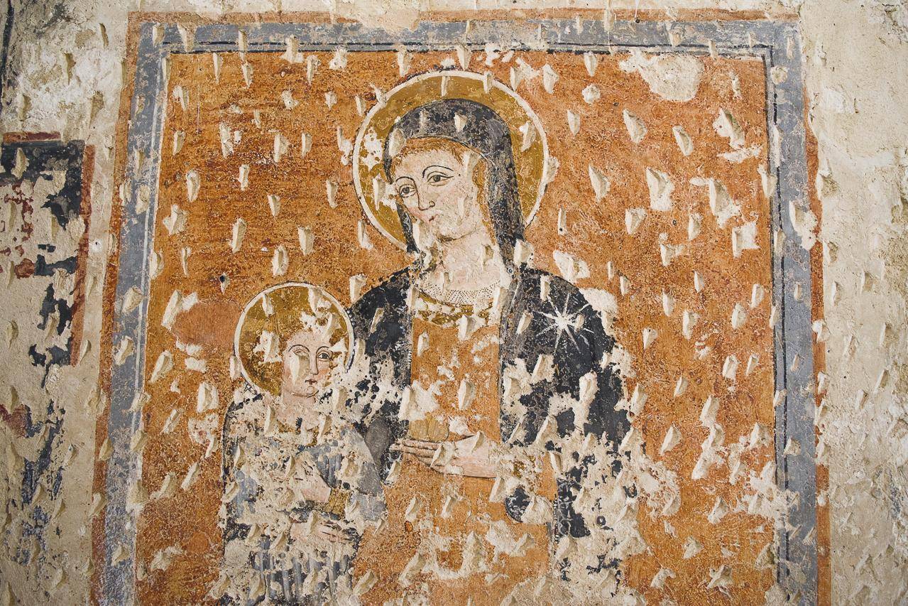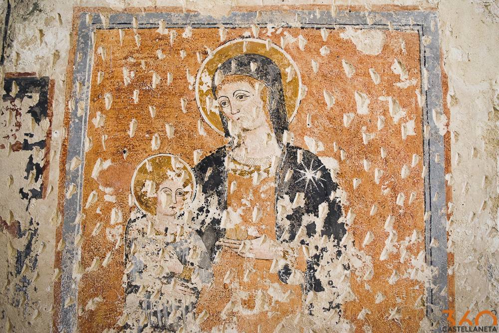 La Madonna con Bambino, dipinto a fresco con finiture a secco, misura 110 cm per 160 cm e presenta i segni di picchiettatura tipici della preparazione alla sovrapposizione di un altro strato di intonaco e dell’aggressione dell’umidità. Si può concludere che la chiesa fosse quasi integralmente decorata da dipinti murali, con le immagini nuove sovrapposte a quelle più antiche deterioratesi a causa dell’umidità. Tuttavia l’esiguità delle rendite dei benefici non consentiva queste opere di rinnovo continuo, così si decise di optare per l’imbiancatura che ricopre ancora oggi la quasi totalità dei muri della chiesetta.