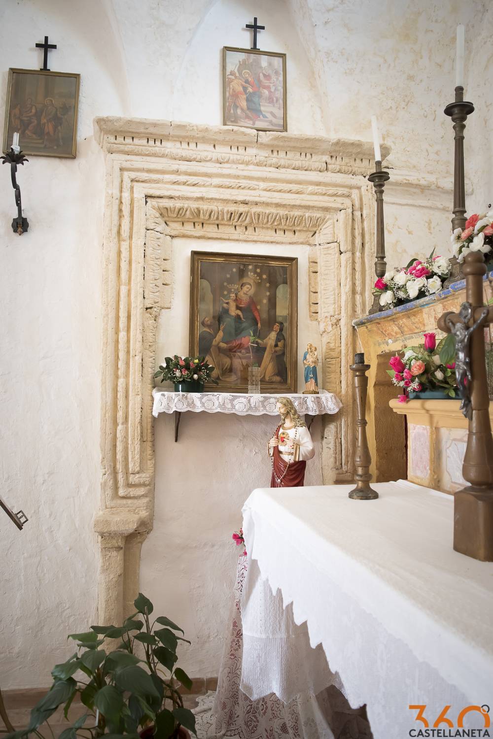 L’interno è costituito da una semplice aula rettangolare con volta a botte lunettata con archetti ogivali poggianti su peducci. In fondo è presente un tramezzo che divide la navata da un ambiente di servizio e al quale si appoggia l’altare in stucco marmorizzato.