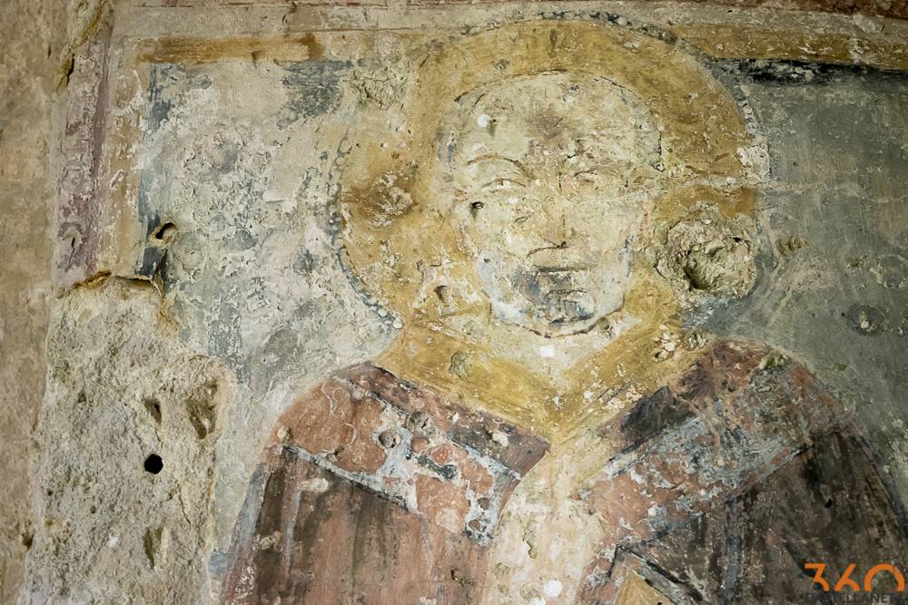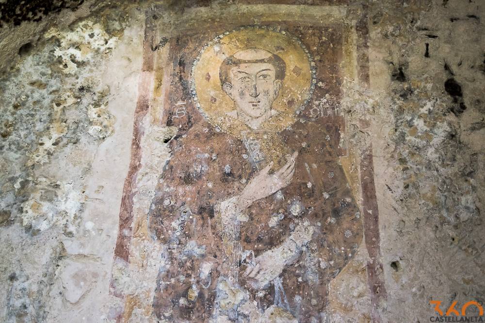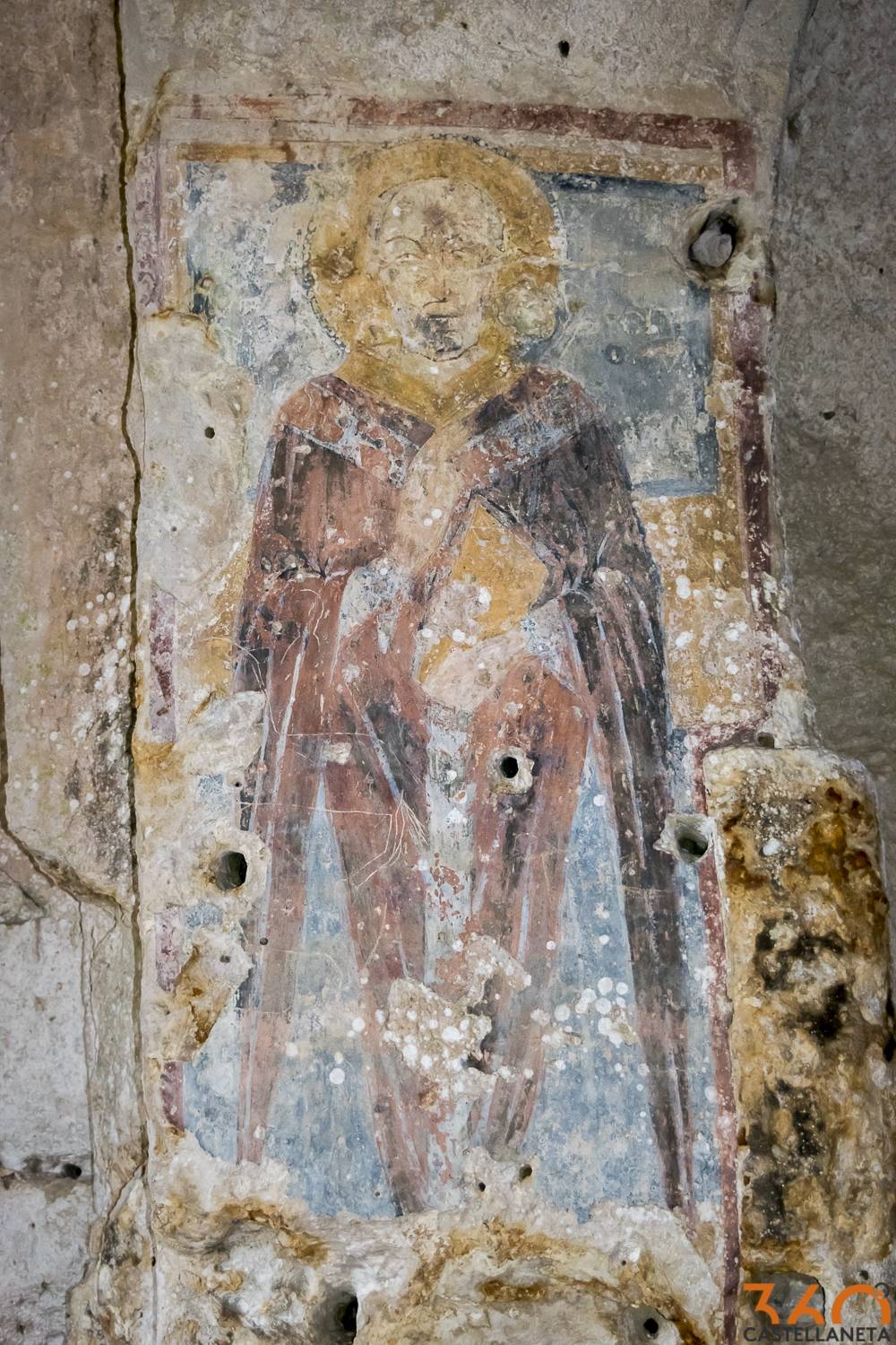 Il primo affresco visibile entrando nella cripta è Santo Stefano, risalente al 1300, che ha dato il nome alla gravina. Anche questo santo, dipinto secondo canoni bizantini, è riccamente vestito; sulla tunica bianca indossa una veste ricamata, la dalmatica, i piedi sono calzati e regge con la mano destra un libro e con la sinistra un incensiere. Lo sfondo è a zone sovrapposte gialla e azzurra, gialla e rossa. La testa è nimbata, il naso e le mani sono allungati. Dell’iscrizione esegetica si legge bene solo la lettera «S», mentre il resto del nome è indecifrabile.